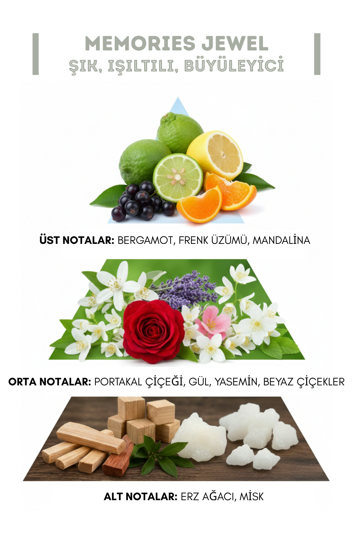 Günlük kullanıma uygun, hafif ama etkileyici yapısıyla Memories Jewel; taze, temiz ve sofistike koku arayan kadınlar için ideal bir tercihtir. Şık tasarımı ve dengeli koku profiliyle her anınıza eşlik eder.